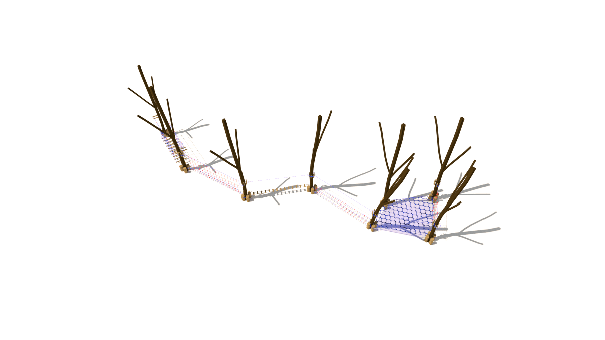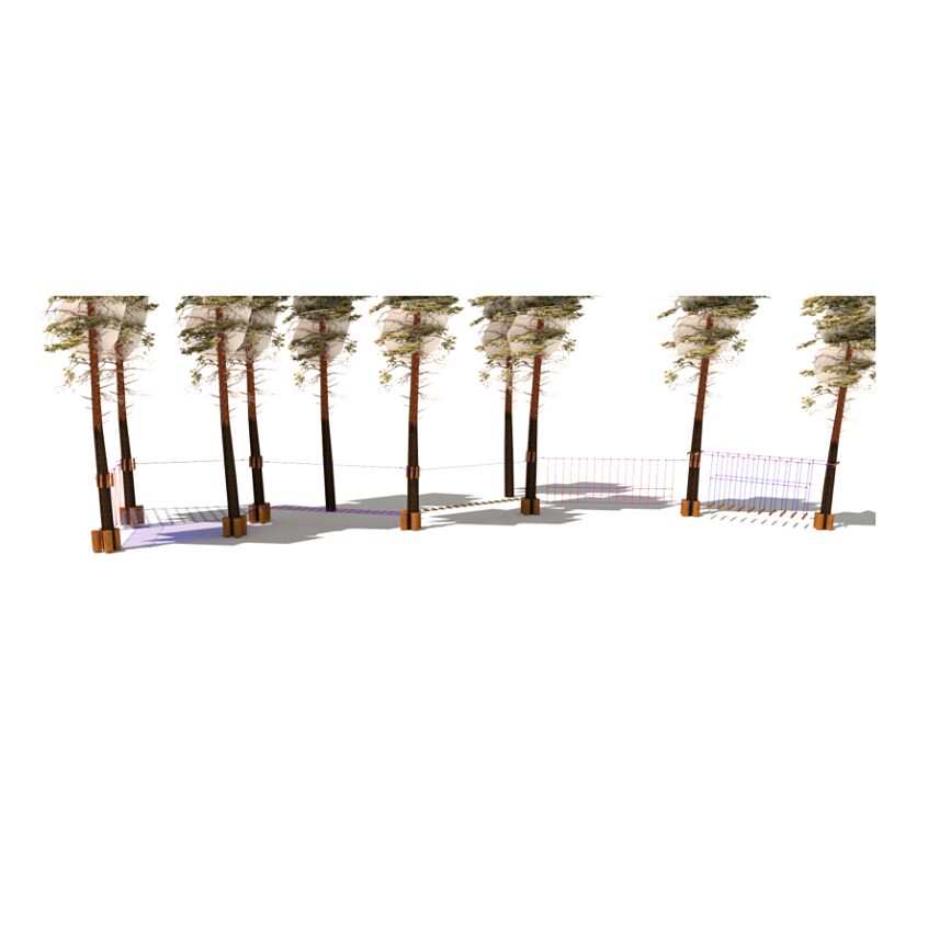 Children’s rope trail between trees with balancing elements, made of acacia and oak wood.