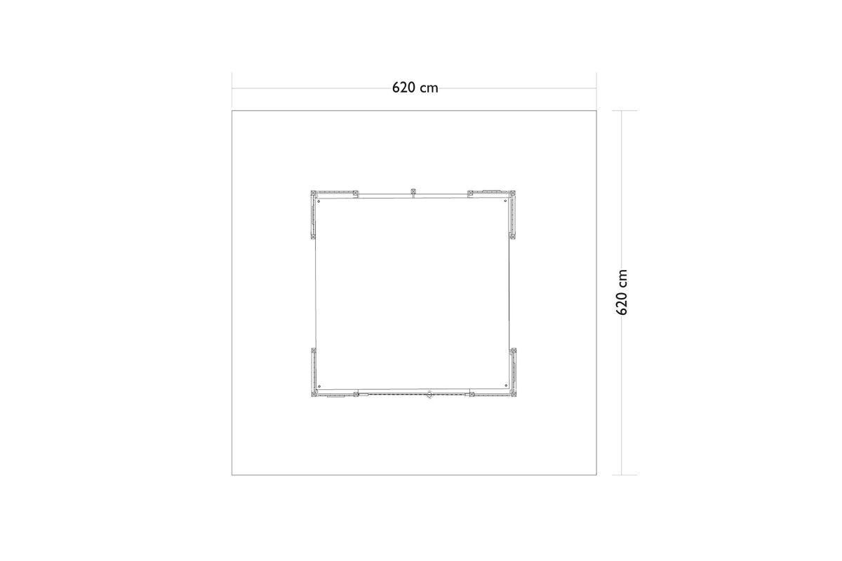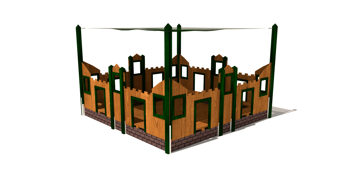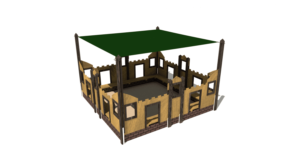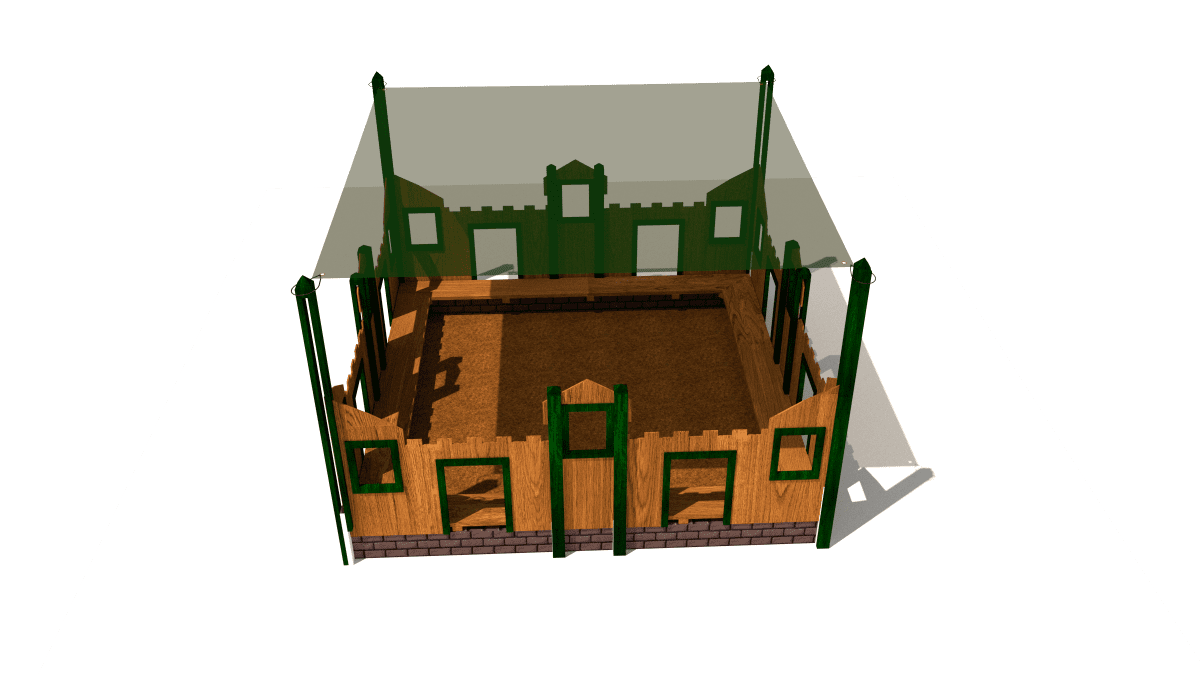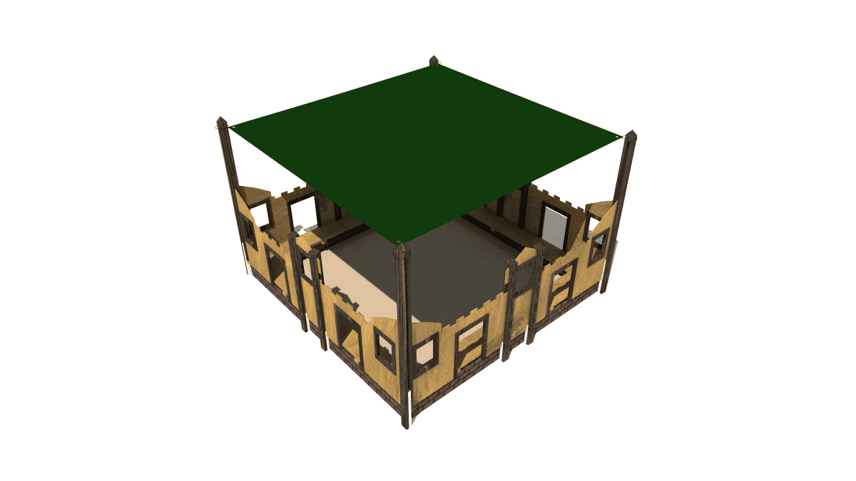 Wooden children’s square sandbox castle with a tarp on poles, made of acacia and oak.