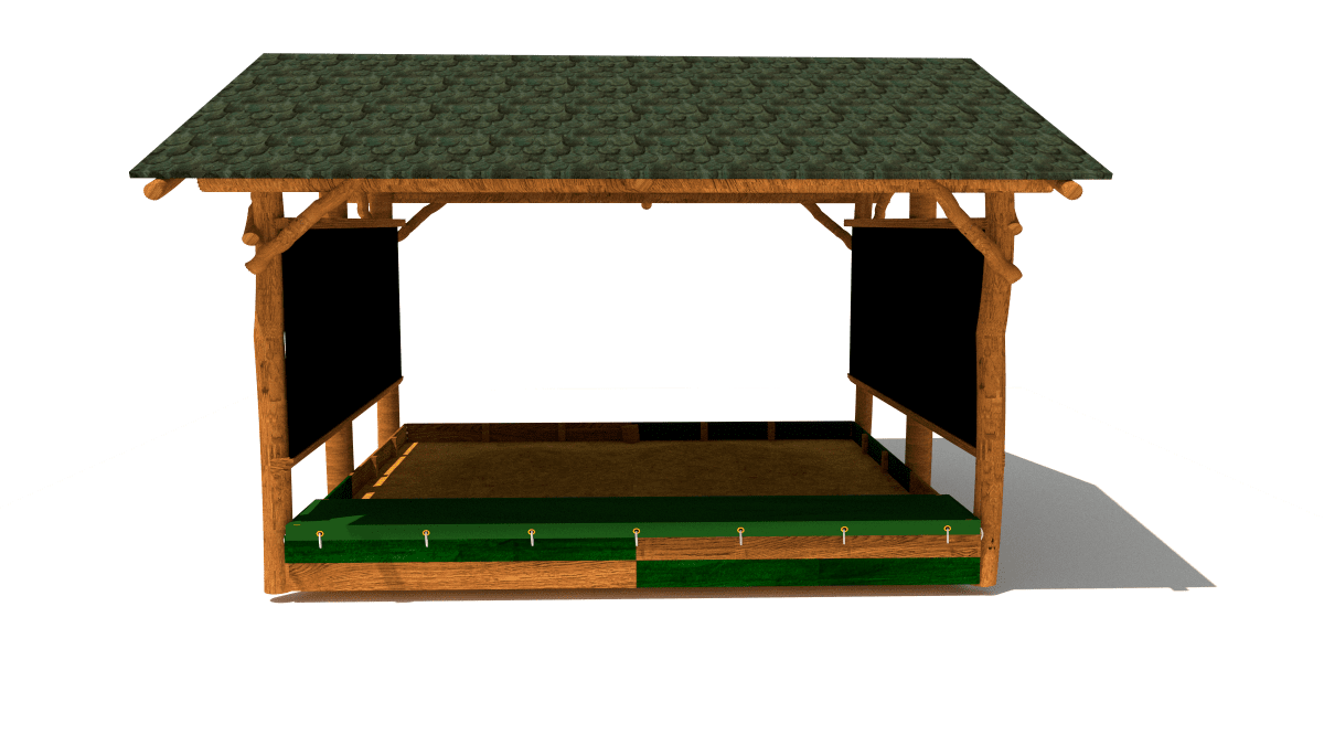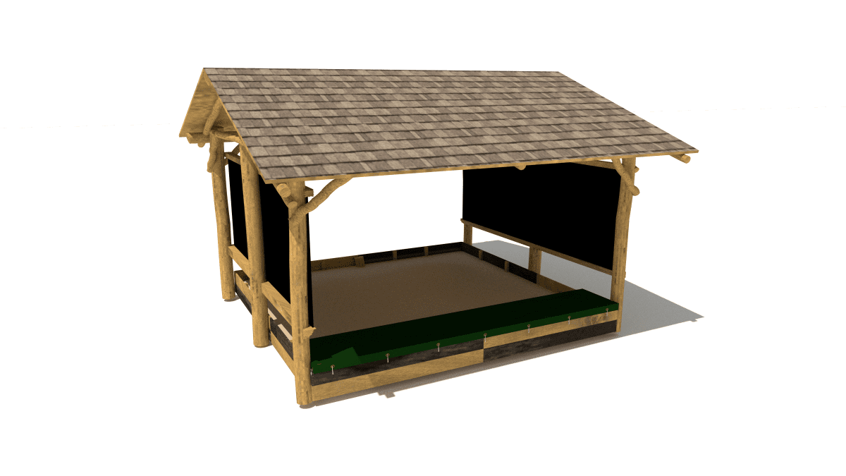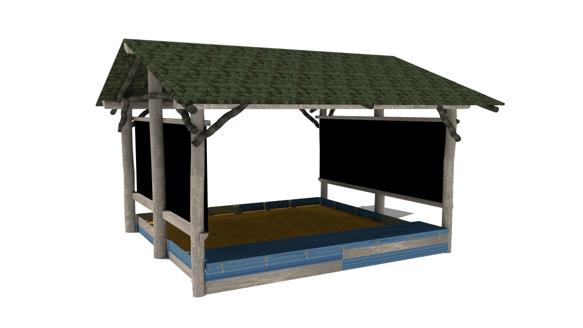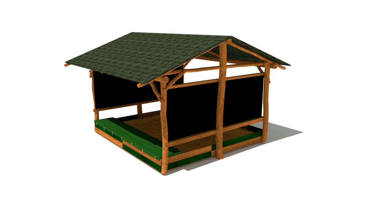 Wooden children’s house-shaped sandbox with chalkboards, made of acacia and oak.
