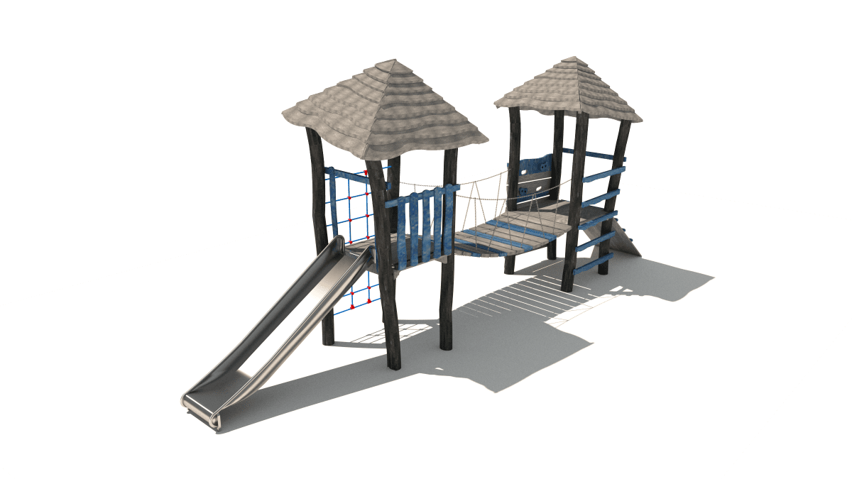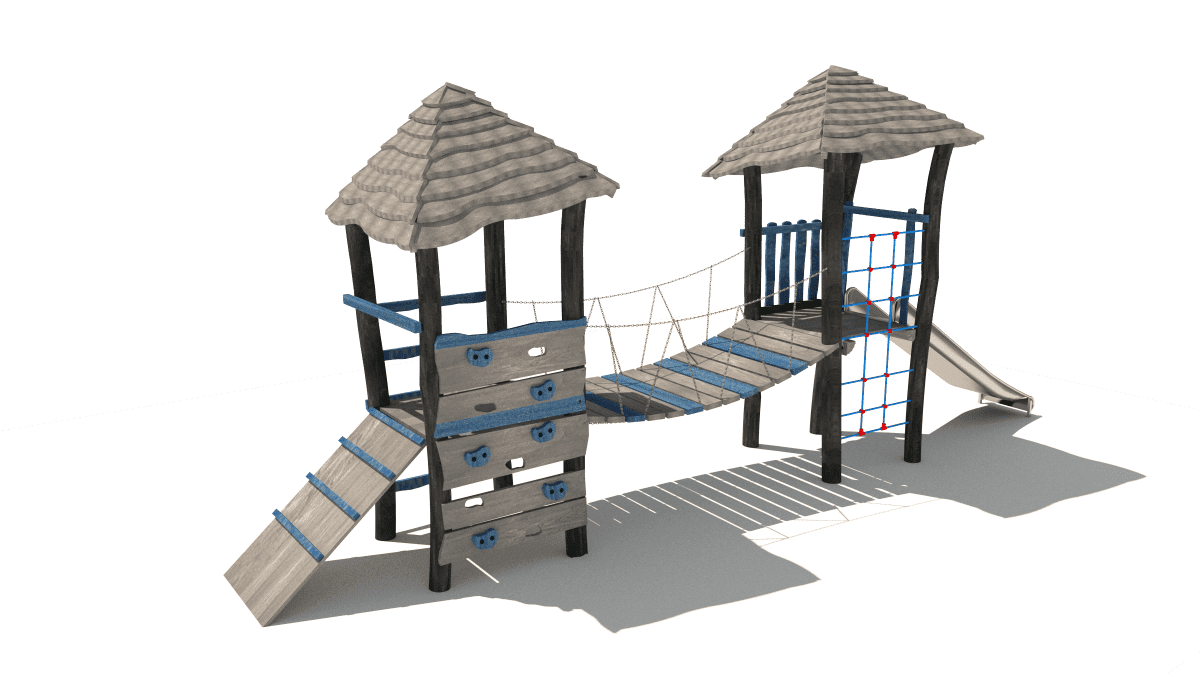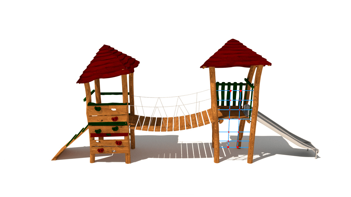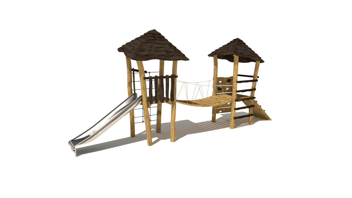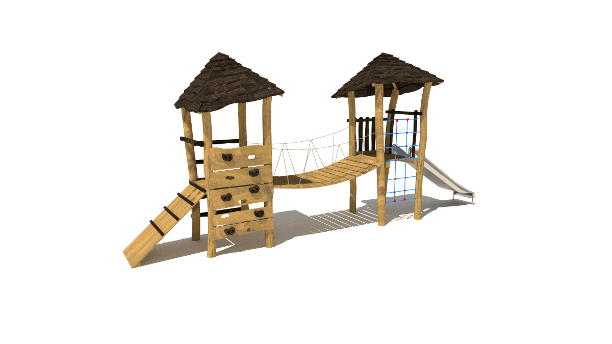 Wooden children’s play set with towers, slide, climbing net, made of acacia and oak wood.