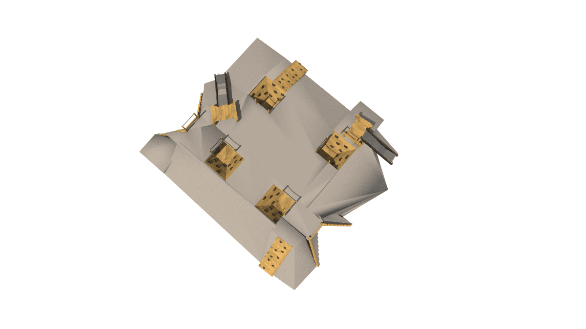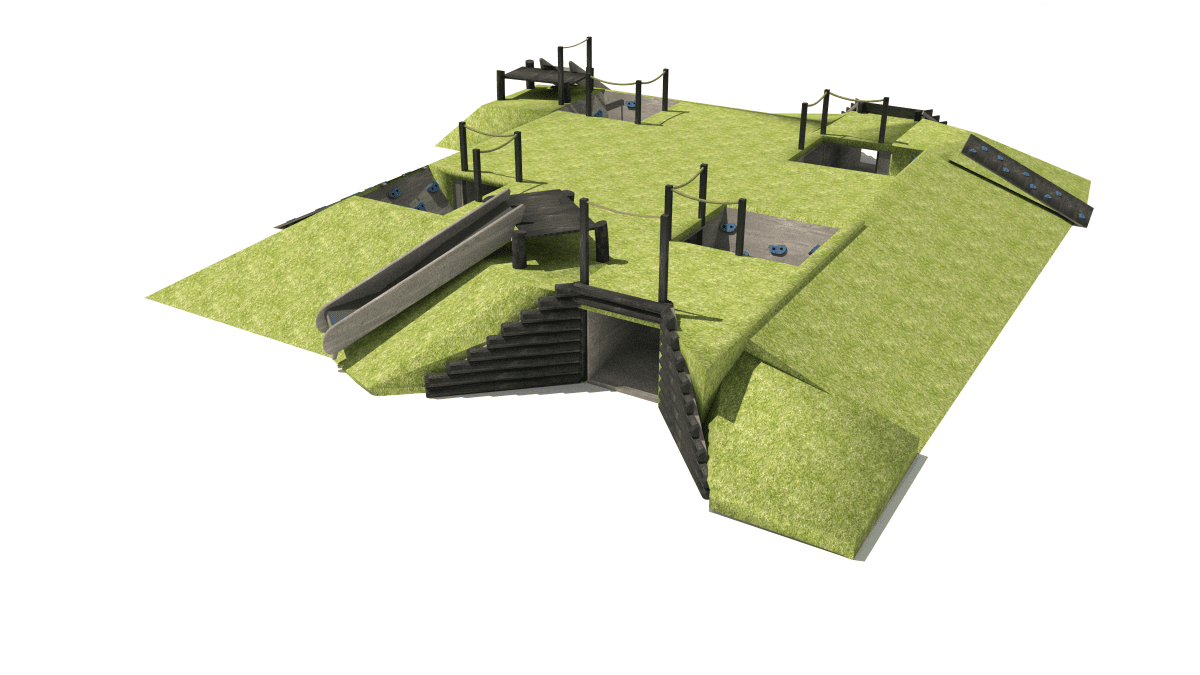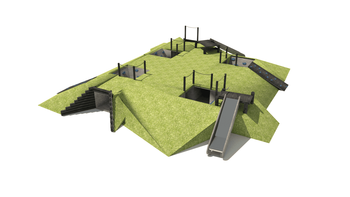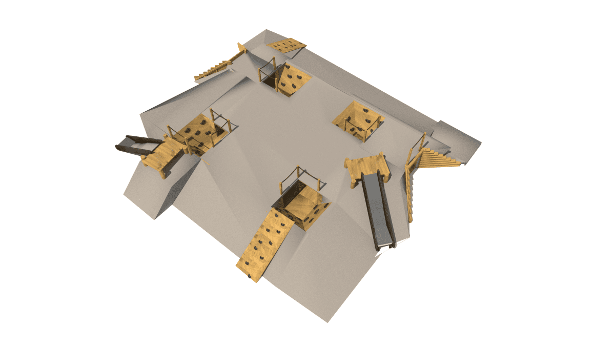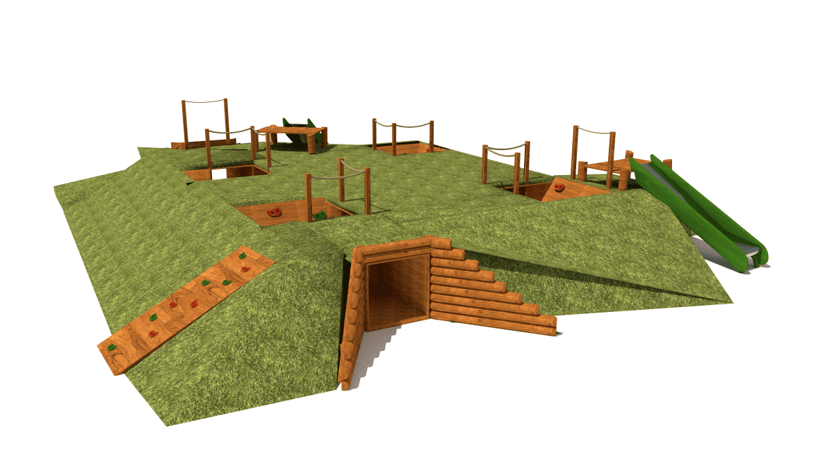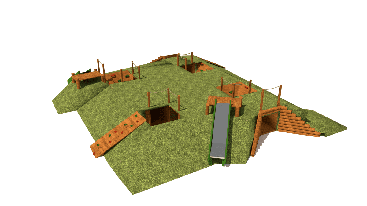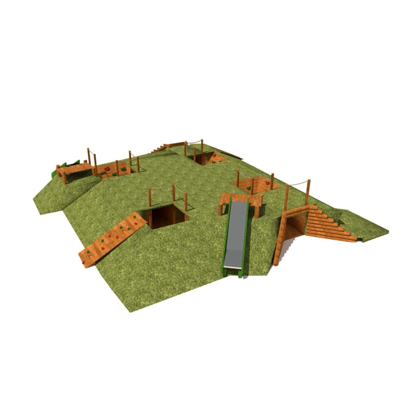 Children’s play set with crawling tunnels, slides, and platforms, made of acacia and oak wood.