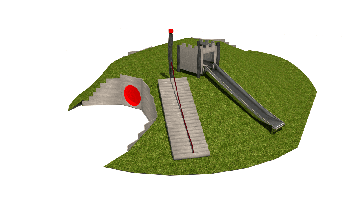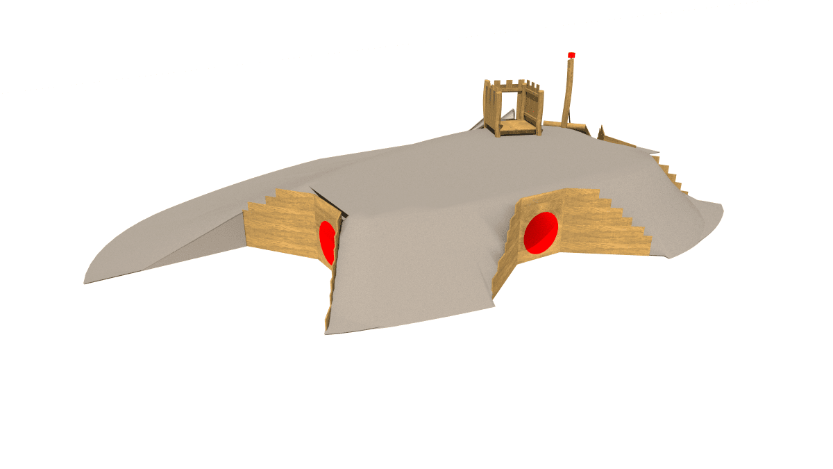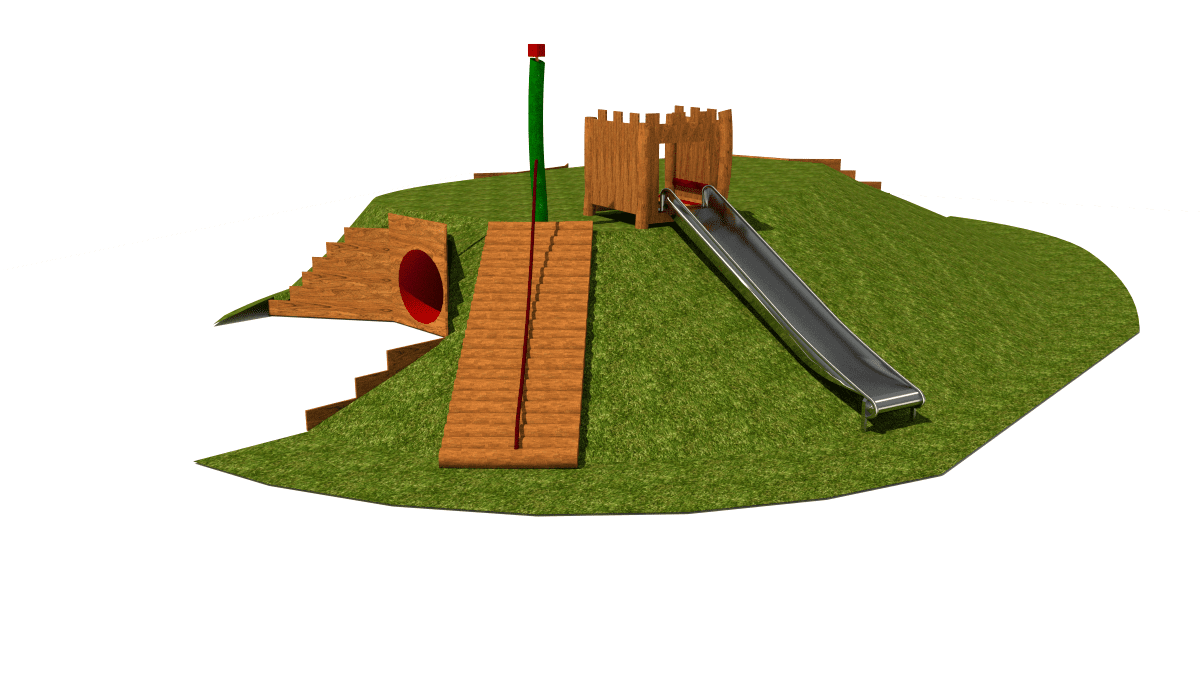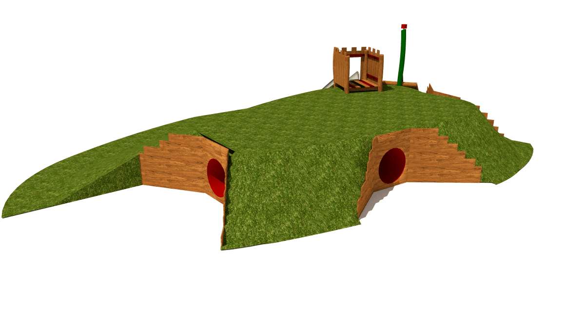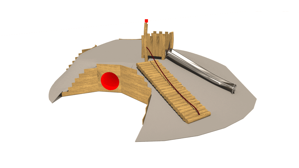 Wooden children’s tunnel play set for crawling with a slope slide and climbing platform, made of acacia and oak wood.