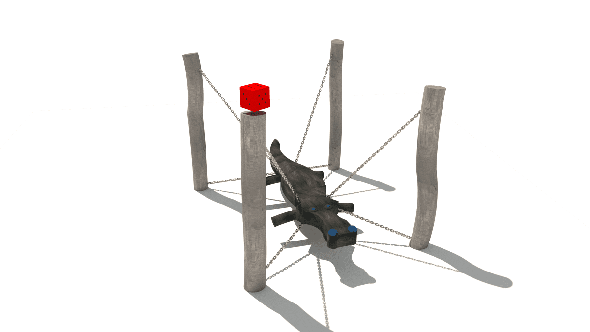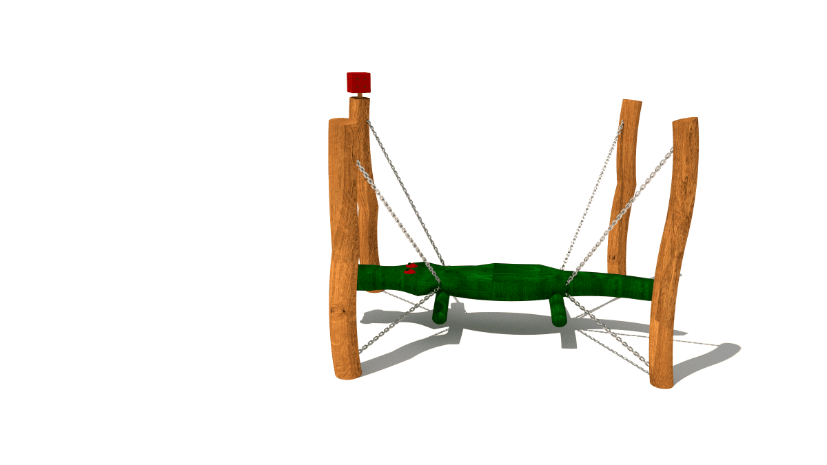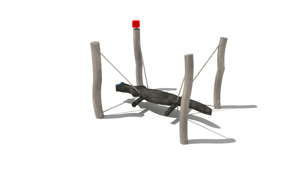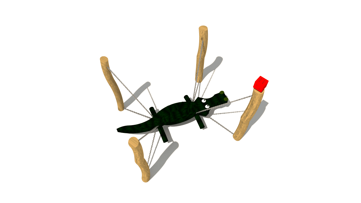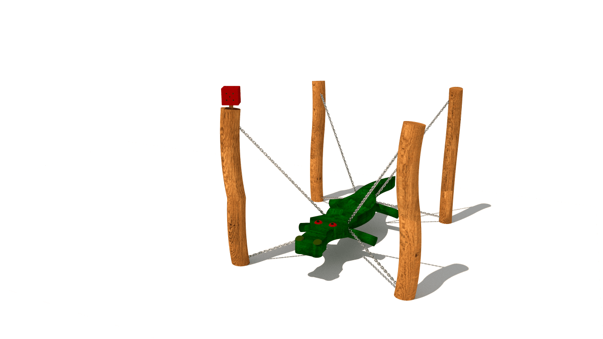 Wooden balancing climbing frame shaped like a hanging crocodile, made of acacia and oak.